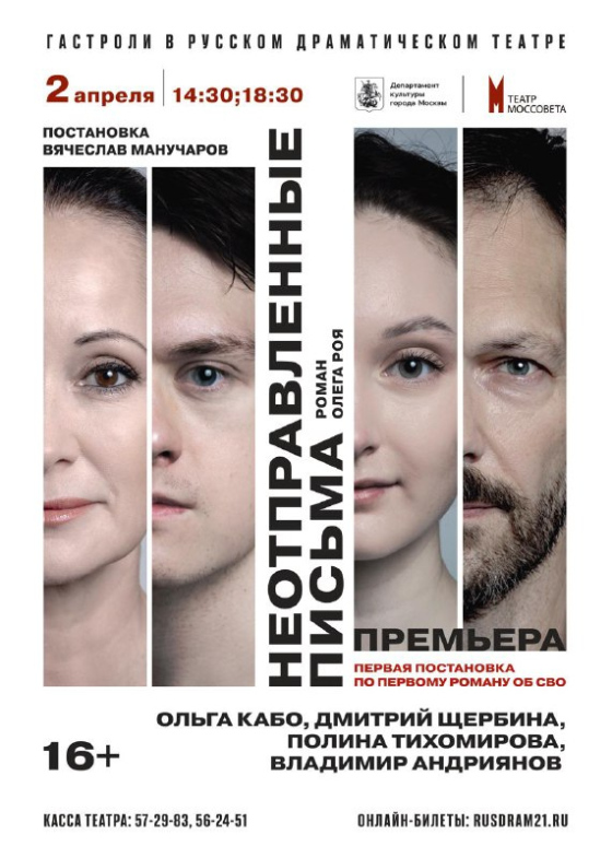 Друзья, 2 апреля актеры театра имени Моссовета представят вам спектакль «Неотправленных письма» — постановку по первому роману об СВО.