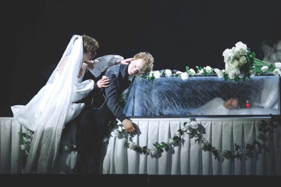Дуэт главных героев — жесткий, антилиричный, во многом провокационный — тоже обретает совсем иное, непривычное звучание: хотя в традиционном понимании они давно стали символами духовной чистоты, возвышенности чувств и идеальных отношений, в сценическом воплощении произведения подобная поэтизация сведена на нет. Наши Ромео и Джульетта — обычные молодые люди, если не сказать малолетки, ничем особо не примечательные, представители так называемого поколения Альфа (рожденные после 2010 года), свободные от каких-либо рамок и комплексов, с клиповым мышлением, быстротой усвояемости информации и архистремительным темпом жизни. Все у них скоро, «в лоб», без лишних «заморочек», условностей и лирических отступлений (чего стоит момент знакомства ребят, когда Джульетта без тени смущения снимает перед Ромео пижамную рубашку и буквально накидывается на него с поцелуем прямо на виду у танцующих). Да и музыкальное оформление, представляющее собой разношерстную «солянку» из песен Ирины Аллегровой, Андрея Лысикова, известного под псевдонимом Дельфин, и группы «Тату», как нельзя более точно свидетельствует о фрагментарности восприятия, разрозненности картины мира и отсутствии четких жизненных ориентиров.